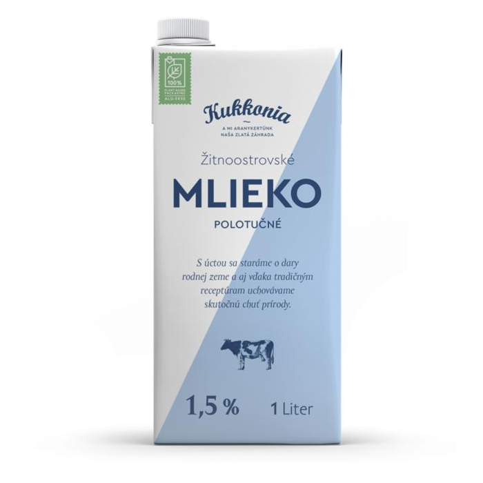 Trvanlivé mlieko polotučné. Ošetrené UHT ohrevom, homogenizované. Tuk najmenej 1,5% hmot.