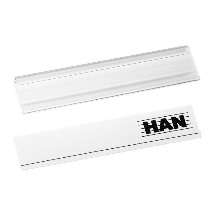 Balenie 10 ks priehľadných čírych klipov z plastu a 10 papierových etikiet na označovanie odkladačov a zásuvkových boxov značky HAN a závesných obalov.