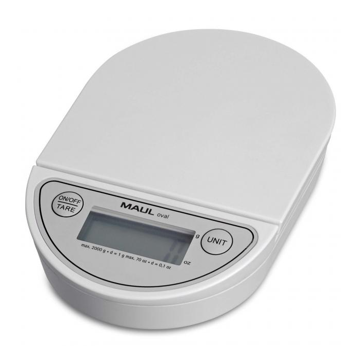 Elektronická váha oválneho tvaru s jedným ovládacím tlačidlom a funkciou automatického vypnutia a automatického vynulovania. Minimálna váha 2 g. Dodávaná s batériou. Rozmery 180 × 120 × 30 mm. Materiál nárazuvzdorný plast. Farba biela. Kapacita 2 kg. Stupňovanie 1 g. Váha nie je určená na použitie v platobnom styku. Napájanie 3V batériou CR2032. Funkcia Tare. Rozmery vážiacej plochy 120 × 120 mm.