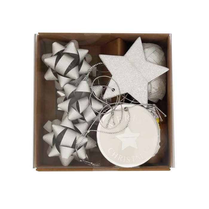Vianočná súprava na balenie darčekov. Obsahuje: stužky 5mmx10m - 2 kusy, mašle - 6 ks, štítky na darčeky - 6 ks.