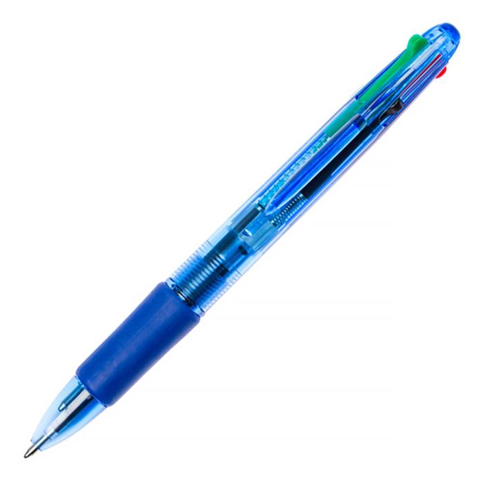 Jednorazové 4‑farebné pero so stláčacím mechanizmom a klipom s gumenou úchytovou zónou.