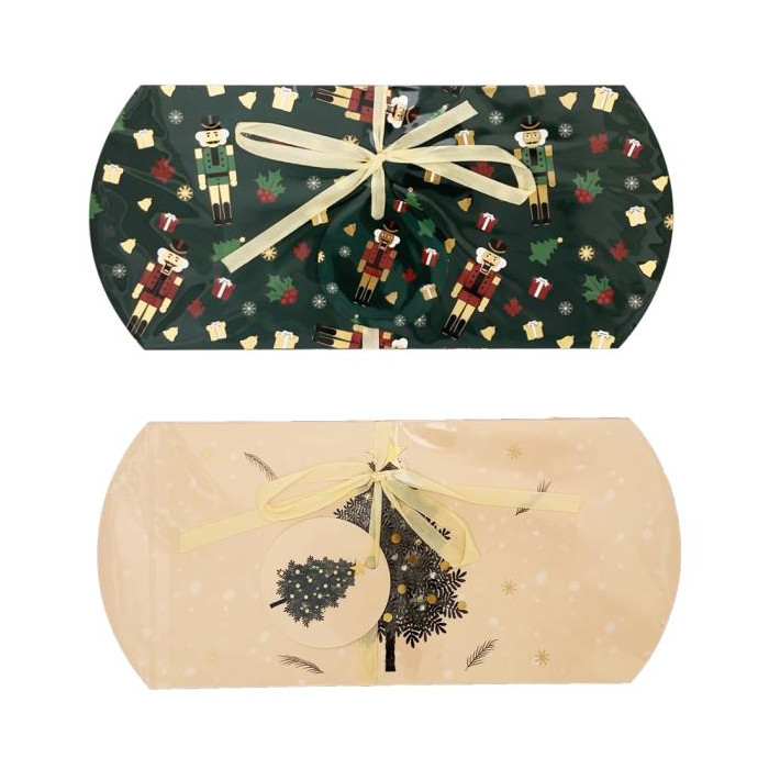 Papierová darčeková krabička pukačka 220x100mm 2 ks mix vianočných motívov. Previazané stuhou s visačkou, elegantný dizajn vhodný na každú príležitosť. Ideálne na balenie malých darčekov, ako sú šperky, darčekové poukážky.
