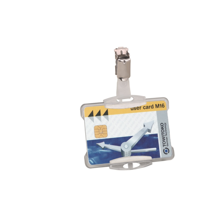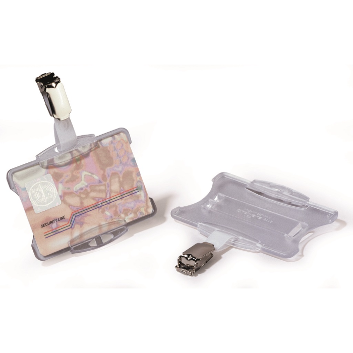 Plastová visačka na jednu plastovú identifikačnú kartu z priehľadného pružného plastu vysokej kvality, z prednej strany otvorená. Vhodná na ochranu magnetických a bezpečnostných kariet pred poškodením. Uchytenie klipu štipcom na kratšej alebo dlhšej strane poskytuje univerzalitu pri použití horizontálne alebo vertikálne označených kariet. Balenie 25 ks.