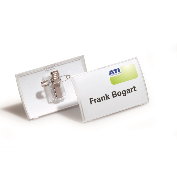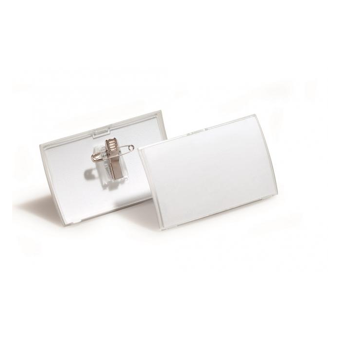Elegantné visačky z pružného plastu s matným povrchom a horizontálnym zaoblením. Uchytenie na zadnej strane štipcom alebo zatváracím špendlíkom. Náhradné papieriky obj. kód DU145302. Balenie 25 ks.