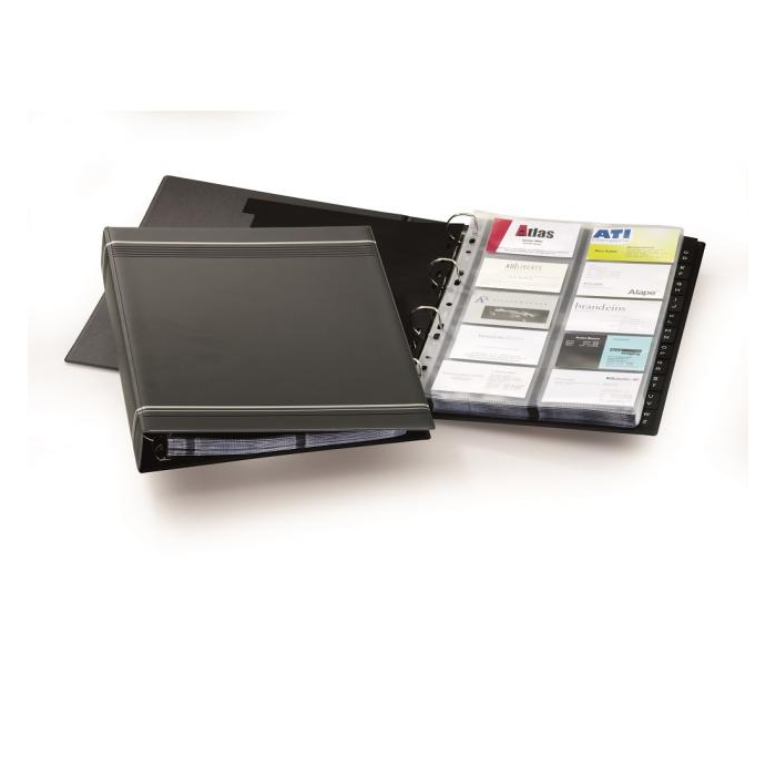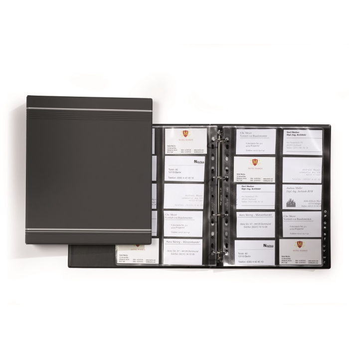 Exkluzívny zakladač na vizitky v úprave matné PVC so 4-krúžkovou mechanikou. 25 obalov z polypropylénu, 12 čiernych rozlišovačov A---Z. V dizajne Visifix s dekoratívnymi prúžkami. Formát A4. Možnosť rozšírenia náhradnými obalmi obj. kód DU2389 19.( V balení 10 ks náhradných obalov.)
