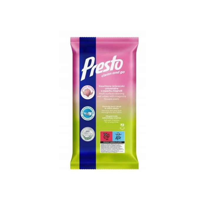 PRESTO CLEAN UNIERZÁLNE VLHČENÉ UTIERKY - MAGNÓLIA 72 ks. Univerzálne utierky Presto s vôňou kvetu magnólie sú určené na čistenie všetkých hladkých povrchov. Účinne odstraňuju nečistoty, zabraňujú usadzovaniu prachu a intenzívne a dlhodobo osviežujú interiér.