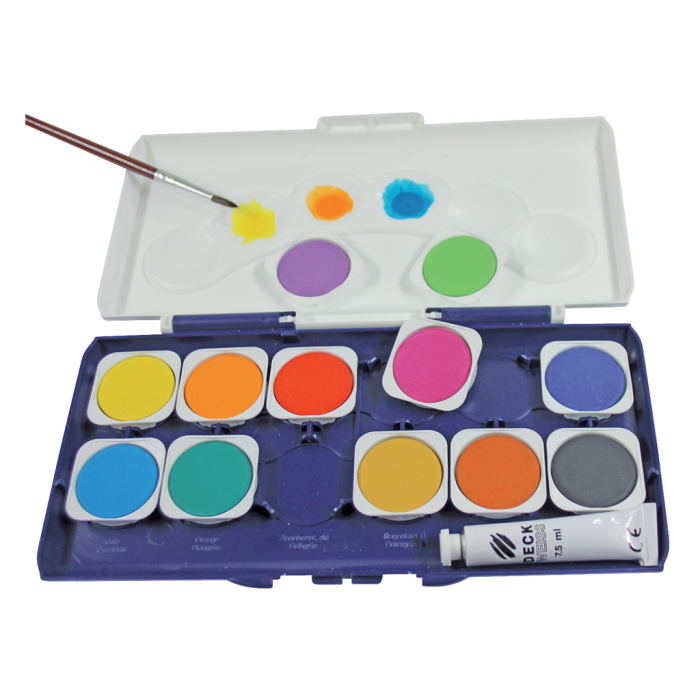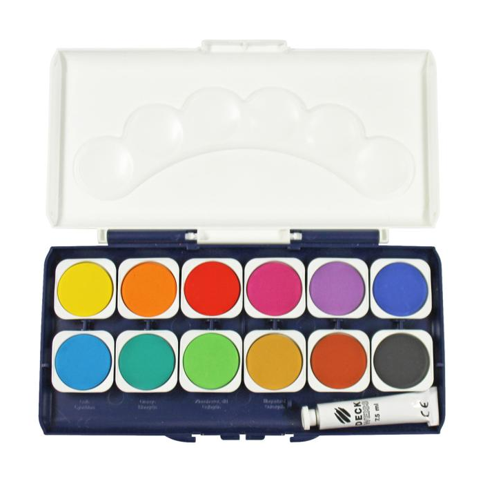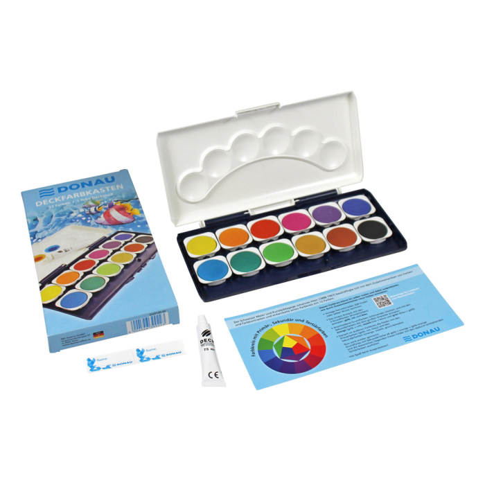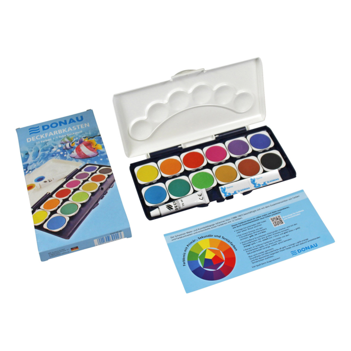 Vodové farby Donau, 12 farieb, vrátane nepriehľadnej bielej. Vyberateľné misky, paleta na miešanie farieb.
