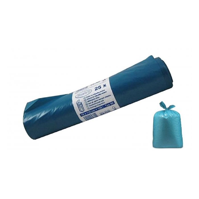Vrecia zaväzovacie zabezpečujú komfort a uľahčujú nepríjemnosť manipulácie s odpadom. Objem 120 ℓ Typ 60. Rozmery 70 x 110 cm. Hrúbka 38 mic. Farba modrá. Balenie 25 ks.