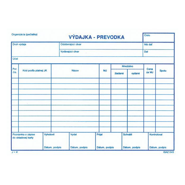 Obchodné tlačivo. Výdajka - prevodka bez DPH, formát A5, blok, 100 listov.