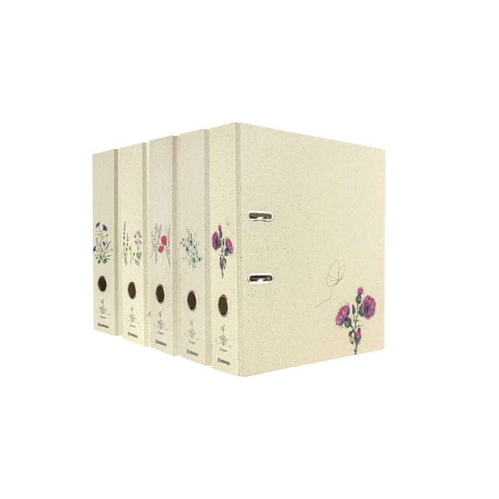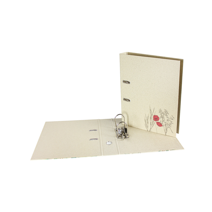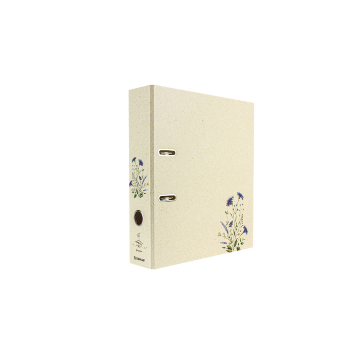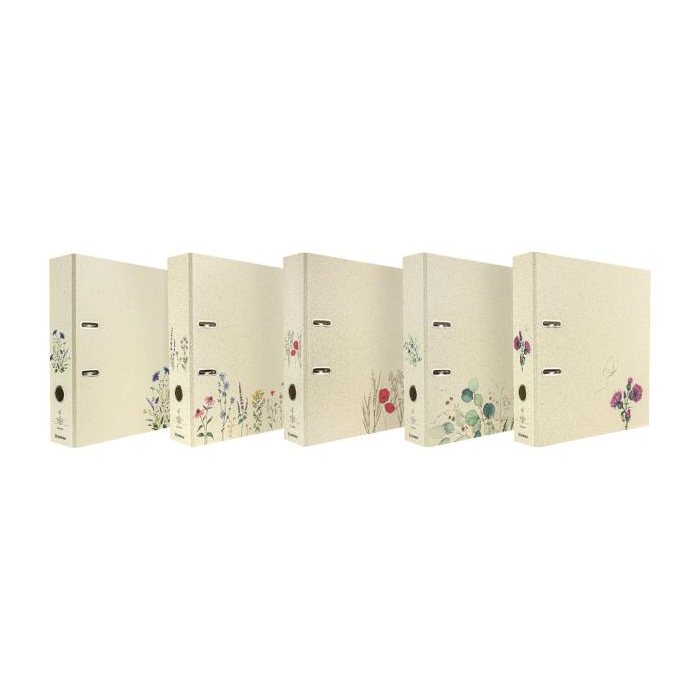 5 vzorov rôznych farieb, vonkajší materiál trávový papier, farebná potlač, vnútorná sivá doska 2,1 mm, vnútorná podšívka prírodný trávový papier, do školy, na univerzitu alebo na uloženie dokumentov z hobby, dovolenky... pre formát DIN A4, šírka chrbta 70 mm, s pákovým mechanizmom, otvorom na prst a priestorovo úspornými očkami (Rado).