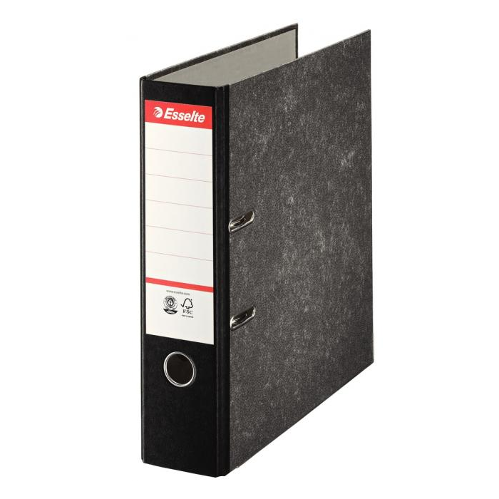 Zakladač formátu A4 so štruktúrovaným papierovým poťahom čierneho mramorového vzoru a pákovou mechanikou s prítlačnou lištou. Vybavený rado zámkom, ochranným spodným kovaním a nalepeným chrbtovým štítkom. Šírka chrbta 7,5 cm. Väčšie balenie 20 ks. Chrbát: 7,5 cm Farba: čierna