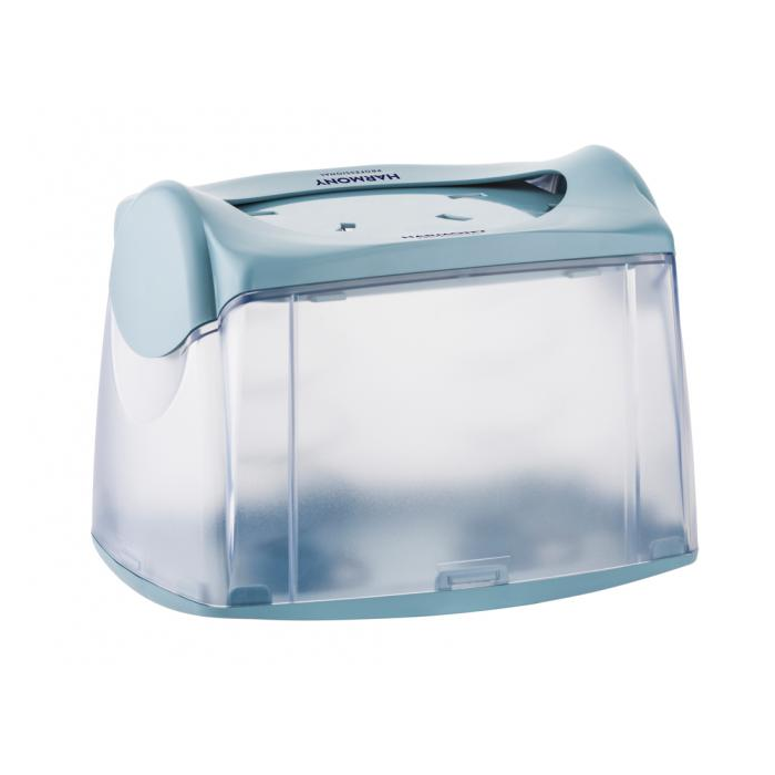 Zásobník HARMONY Professional na skladané servítky stolový malý. Voľne stojaci stolový zásobník z ABS plastu s pružinou, ktorá servítky posúva k otvoru na vyťahovanie. Uzamykateľný západkou. Kapacita 200 servítkov. Farba číra, kryt a podstavec tyrkysový.
