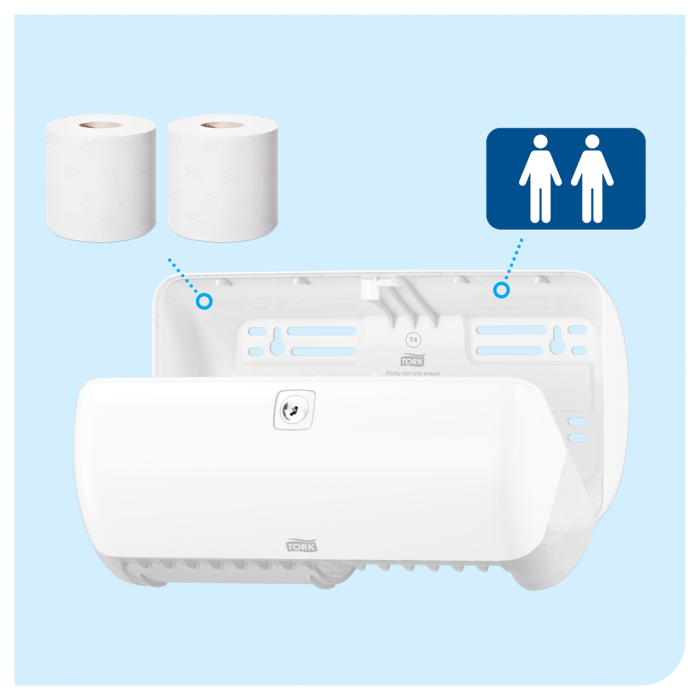 Tork zásobník na toaletný papier v konvenčnom kotúči v dizajne Elevation je vhodný do menej navštevovaných toaliet a umyvární a znižuje údržbu tým, že pojme až dva konvenčné kotúče. Zásobníky Elevation majú praktický a moderný dizajn, ktorý zanecháva v hosťoch dlhodobý dojem.
