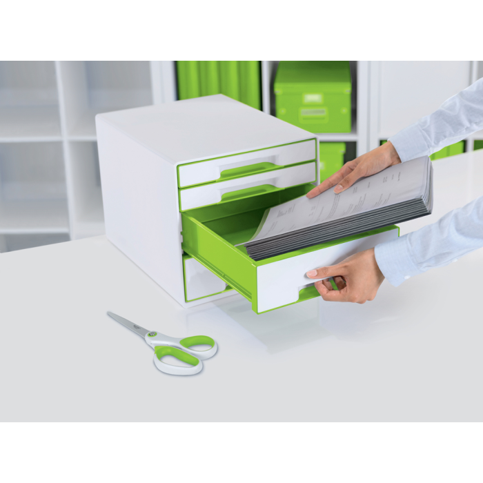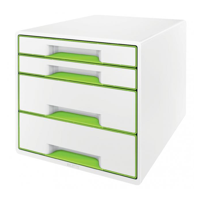 Box, dopĺňajúci produktovú radu Leitz WOW. Ľahko vysúvateľné 2 malé a 2 veľké zásuvky so zarážkou proti úplnému vysunutiu, jednoduché otváranie a zatváranie. Gumové nožičky pre lepšiu stabilitu, rozlišovač na popis zásuvky. Rozmery 287 × 270 × 363 mm. Farba zelená.