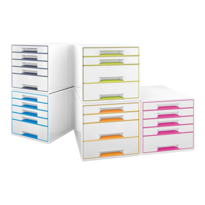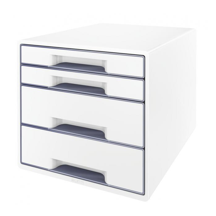 Box, dopĺňajúci produktovú radu Leitz WOW. Ľahko vysúvateľné 2 malé a 2 veľké zásuvky so zarážkou proti úplnému vysunutiu, jednoduché otváranie a zatváranie. Gumové nožičky pre lepšiu stabilitu, rozlišovač na popis zásuvky. Rozmery 287 × 270 × 363 mm. Farba perleťovo biela/sivá.