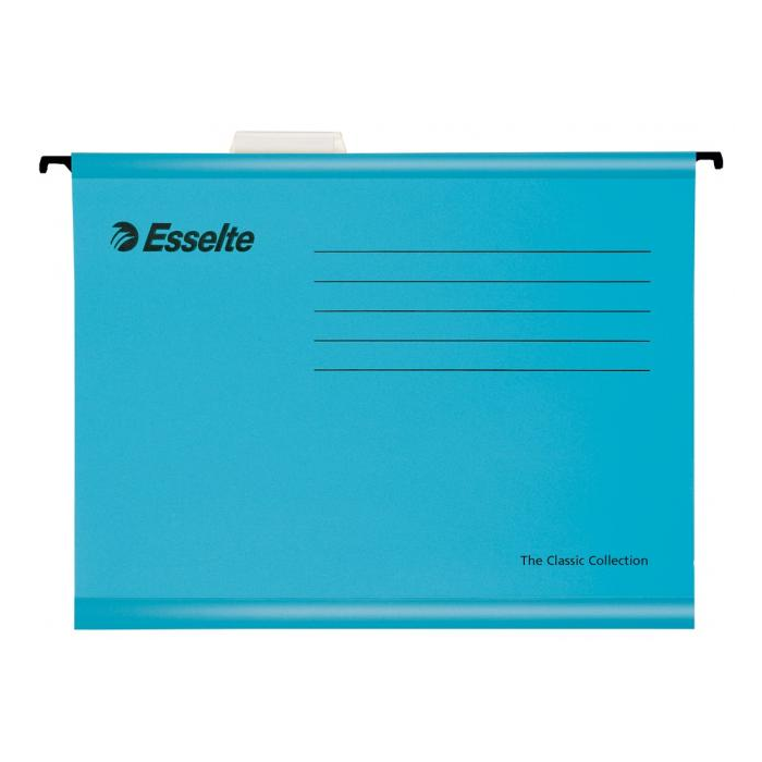 Závesné obaly Esselte kolekcie Classic vyrobené z pevného kartónu. Lisované dno obalu dovoľuje zvýšiť kapacitu na 30 mm. Súčasťou obalu je násuvný index z priehľadného plastu s výmenným papierovým štítkom. Formát A4, rozpätie vodiacich líšt 330 mm. Farba: jasná modrá Balenie: 25 ks