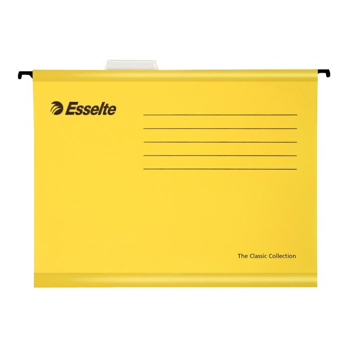 Závesné obaly Esselte kolekcie Classic vyrobené z pevného kartónu. Lisované dno obalu dovoľuje zvýšiť kapacitu na 30 mm. Súčasťou obalu je násuvný index z priehľadného plastu s výmenným papierovým štítkom. Formát A4, rozpätie vodiacich líšt 330 mm.