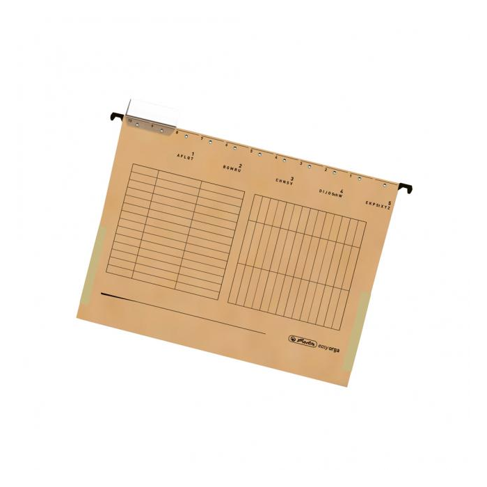 Závesné obaly z recyklovaného kartónu Manila gramáže 230 g / m² s indexom z priehľadného plastu s výmenným papierovým štítkom. Rozpätie vodiacich líšt 330 mm. Farba hnedá. Balenie 5 ks.