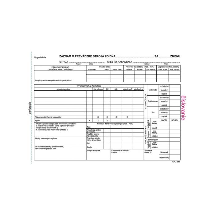 Tlačivo : Záznam o prevádzke stroja A5 číslovaný, balenie 100 listov.