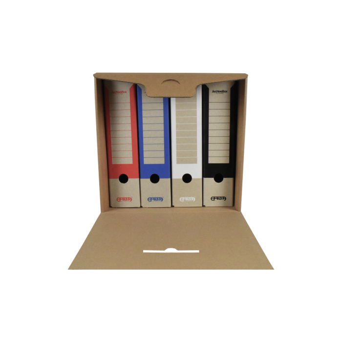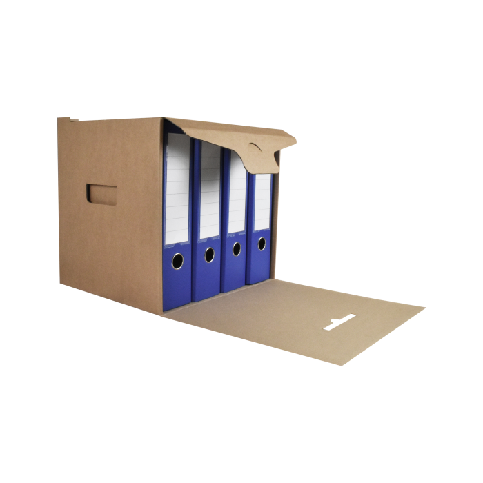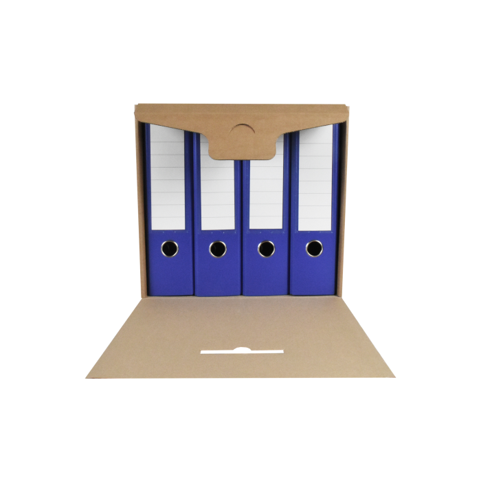 Box na uskladnenie 4 zakladačov so šírkou chrbta 7,5 - 8 cm. Vyrobený z kvalitnej trojvrstvovej vlnitej lepenky H/ H so zelenou potlačou. Konštrukcia boxu je spevnená zosilnením bočných stien. Umožňuje uloženie 4 skupinových boxov na seba, čím nahrádza kovový regál na miestach, kde ho z priestorového hľadiska nie je vhodné umiestniť.