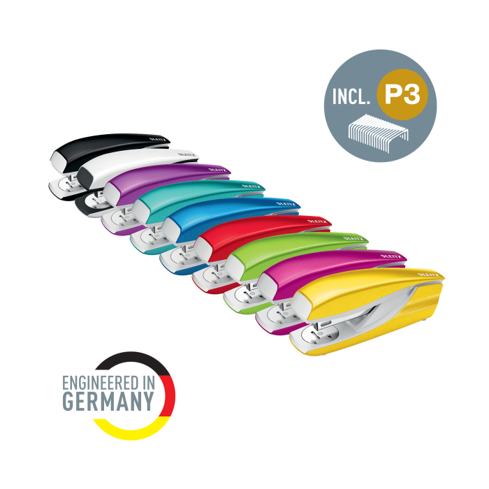 Pevná a spoľahlivá zošívačka rady WOW v žiarivej farbe s novou DIT technológiou na perfektné zošívanie. Integrovaný vyberač spiniek, základňa z kovu, rameno kov/-plast, protišmykové plastové dno. Zošívanie otvorené, uzatvorené a nástenkové. Kapacita 100 spiniek 24/-6 alebo 140 spiniek 26/-6. Kapacita zošívania 30 listov. Hmotnosť 265 g. 10-ročná záruka. Štartovacie balenie 200 ks spiniek 24/-6.