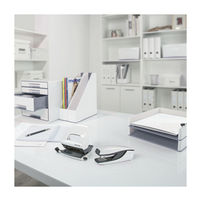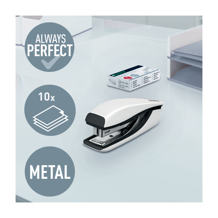 Malá zošívačka v moderných žiarivých farbách ideálna nielen do kancelárie, ale aj domov alebo na cesty. Vždy perfektné zošitie vďaka patentovanej technológii DIT. V kombinácii so spinkami Leitz Power Performance P2 (č. 10) dosiahnete vždy jednoduché a správne zošitie.Kapacita 10 hárkov. Vrecková zošívačka. Patentovaná technológia DIT na spoľahlivé zošívanie. Balenie v škatuľke, vrátane spiniek. Otvorením ramena o 180° je možné použiť nástenkové zošívanie (takrovanie). Farba biela.