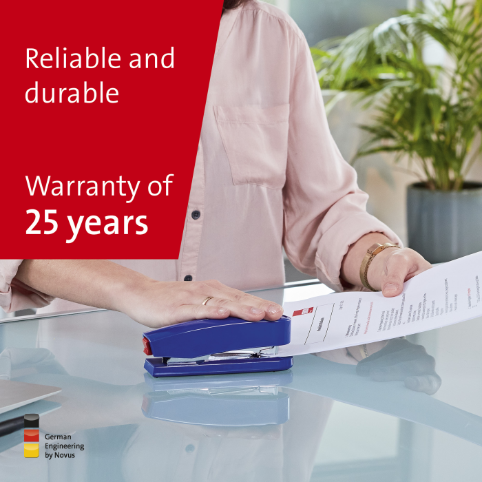 Kompaktná vysokovýkonná zošívačka v kovovom prevedení s plastovým vrchným dielom a dvojitým vedením spiniek. Kapacita náplne 100 spiniek 24/6 - 8 alebo 150 spiniek 26/6 - 8. Hĺbka zošívania 6,5 cm. Hmotnosť 245 g. Záruka 25 rokov.
