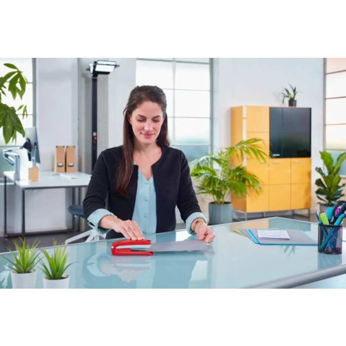 Užitočná celokovová kancelárska zošívačka na každý písací stôl z kolekcie Evolution so stabilnou protišmykovou spodnou časťou. Plastový vrchný diel, integrovaná plastová rozošívačka na zadnej časti, otočná matrica pre otvorený a uzavretý spôsob zošívania. Kapacita náplne 100 spiniek veľkosti 24/6, resp. 150 spiniek veľkosti 26/6. Kapacita zošitia 25 listov papiera. Hĺbka zošívania 5,3 cm. Hmotnosť cca 165 g. Záruka 10 rokov. Farba červená/sivá.