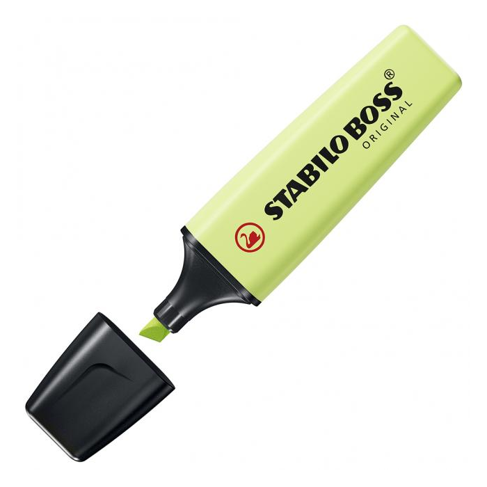 Jedinečný zvýrazňovač v 6 nových pastelových odtieňoch. V 2 šírkach stopy. Vhodný pre prácu s papierom, kópiami a faxom. Vydrží až 4 hodiny bez vrchnáčika a nevyschne. Značková kvalita od vynálezcu zvýrazňovača - BOSS Original je na trhu už od roku 1971. Nezameniteľný tvar zvýrazňovača, ktorý je možné použiť kdekoľvek. Farba limetková.